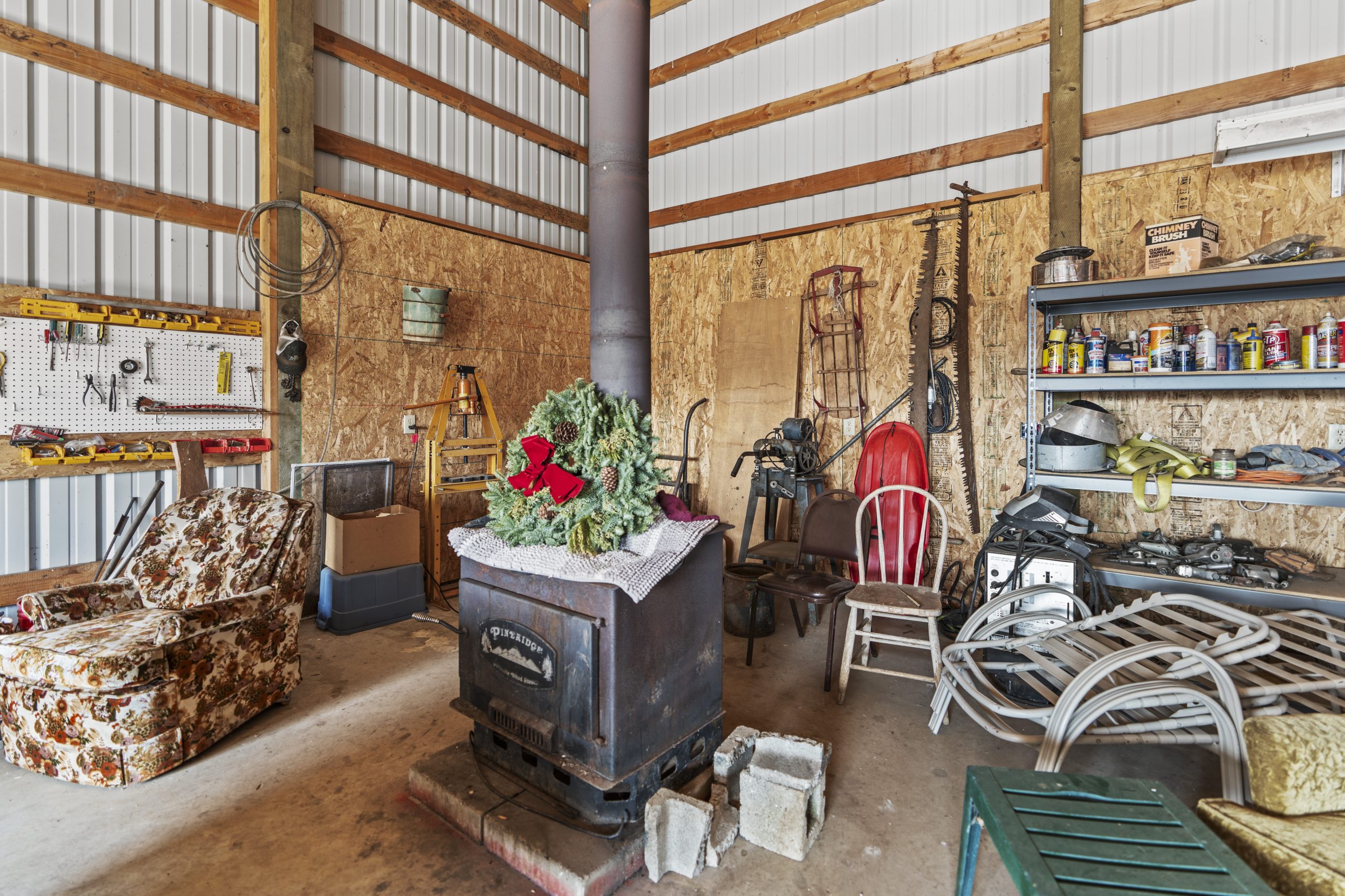 The larger shop is outfitted with a wood stove and is ideal for equipment maintenance and year-round projects.